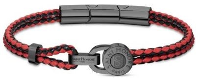 Браслет из нержавеющей стали с темно серым покрытием и красно черной плетеной кожи телёнка.