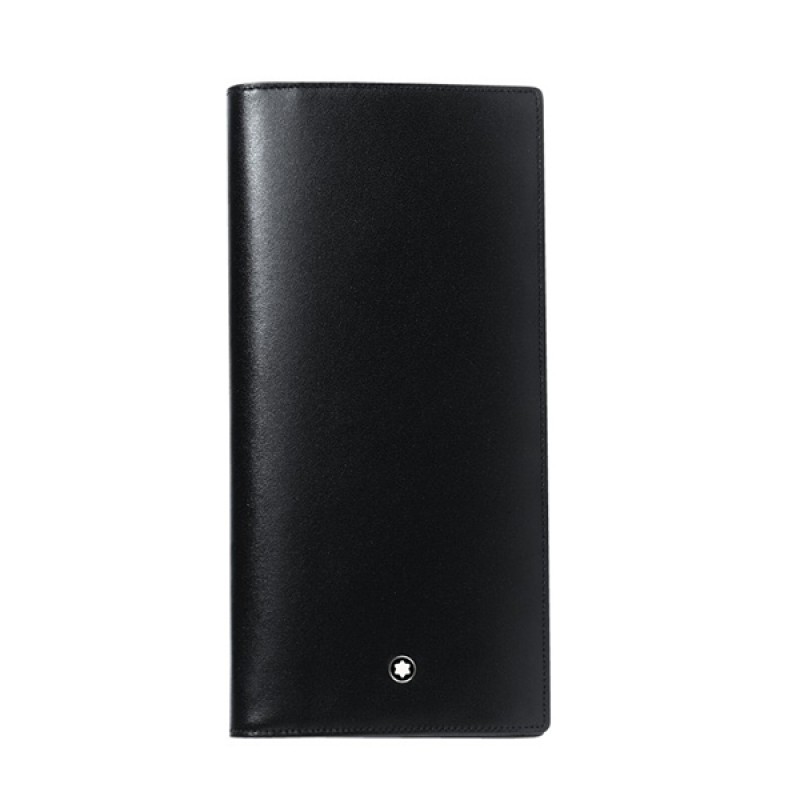 Размеры 9,5 х 19 см. Бумажник Meisterstuck. Внутри 14 отделений для кредитных карт, большое отделение на молнии, 2 отделения для купюр, 2 дополнительных отделения. Блестящая зернистая воловья кожа, хромовое дубление, полностью прокрашенная. Цвет Черный. Фурнитура из нержавеющей стали, эмблема Montblanc, кольцо с палладиевым напылением.