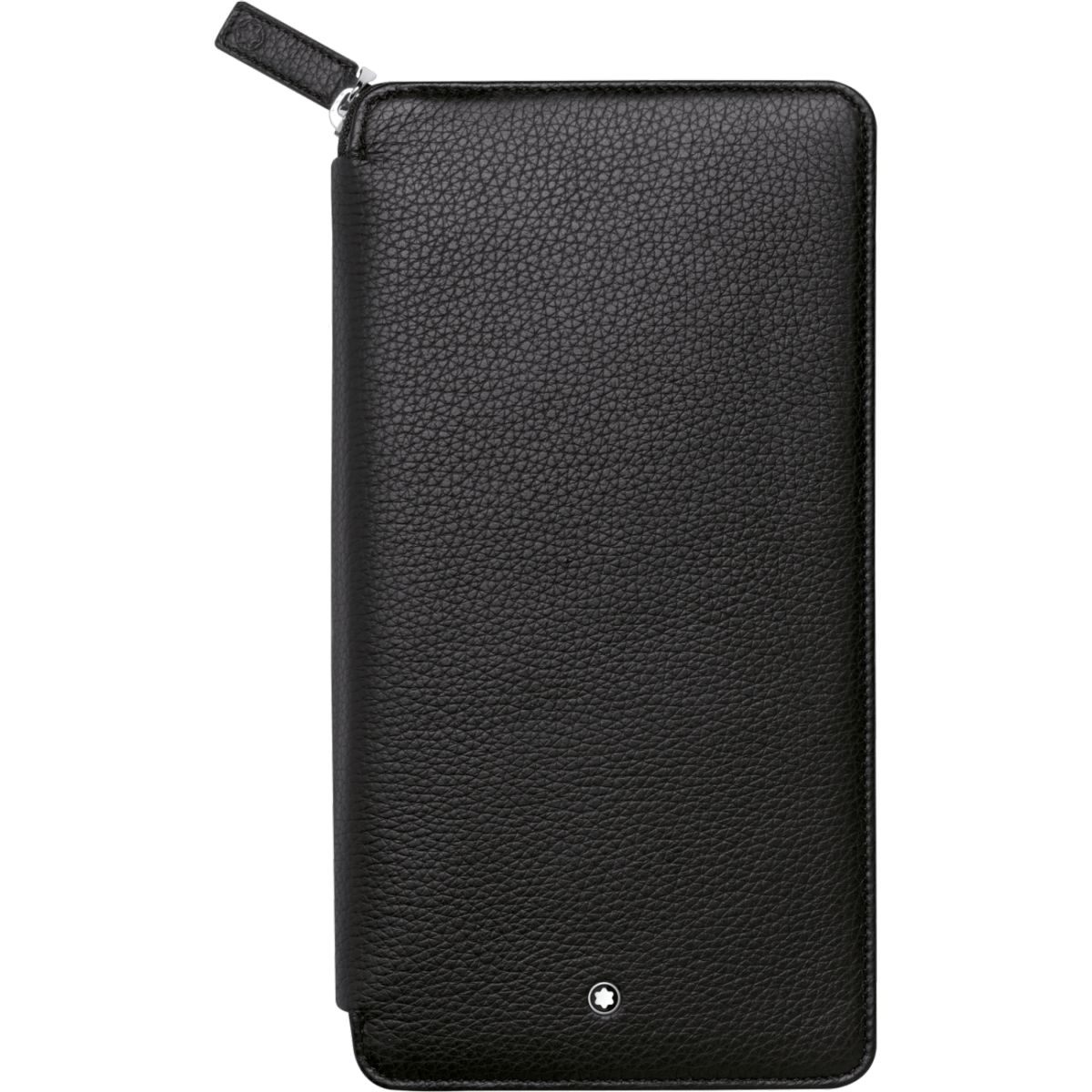 Бумажник для путешествий на молнии Meisterstuck Soft Grain. Внутри 13 отделений для кредитных карт, большое отделение для авиабилета, большое отделение на молнии, 3 дополнительных отделения, отделение для монет с клапаном. Петля для 1 пишущего инструмента размера Meisterstuck Classique или LeGrand. Фурнитура из нержавеющей стали, эмблема Montblanc, кольцо с палладиевым напылением.