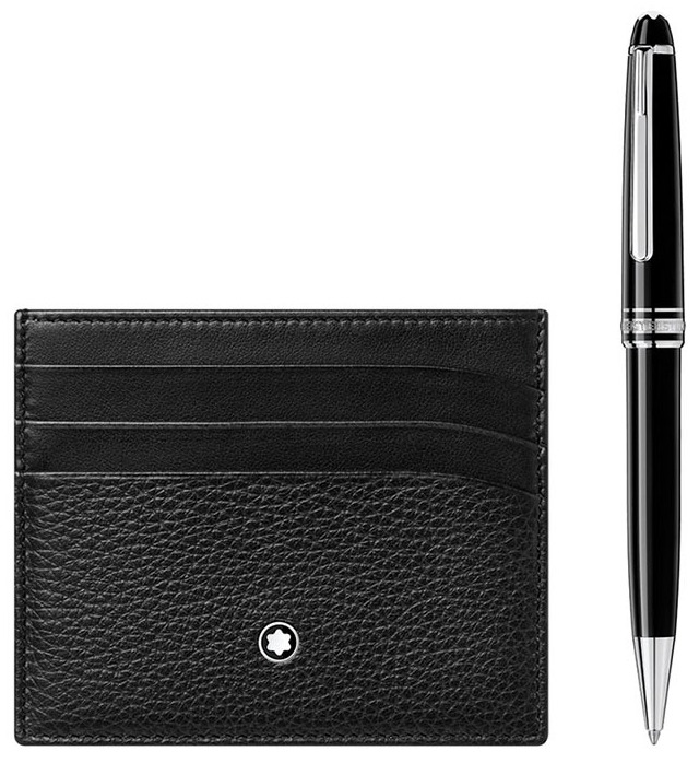 Набор состоит из шариковой ручки Meisterstuck размера Classique с платиновым покрытием и визитницы Meisterstück Soft Grain на 6 карт. Пишущий инструмент имеет колпачок и корпус из черной драгоценной смолы с белой эмблемой Montblanc, инкрустированной в верхней части колпачка. Визитница из мягкой зернистой кожи.