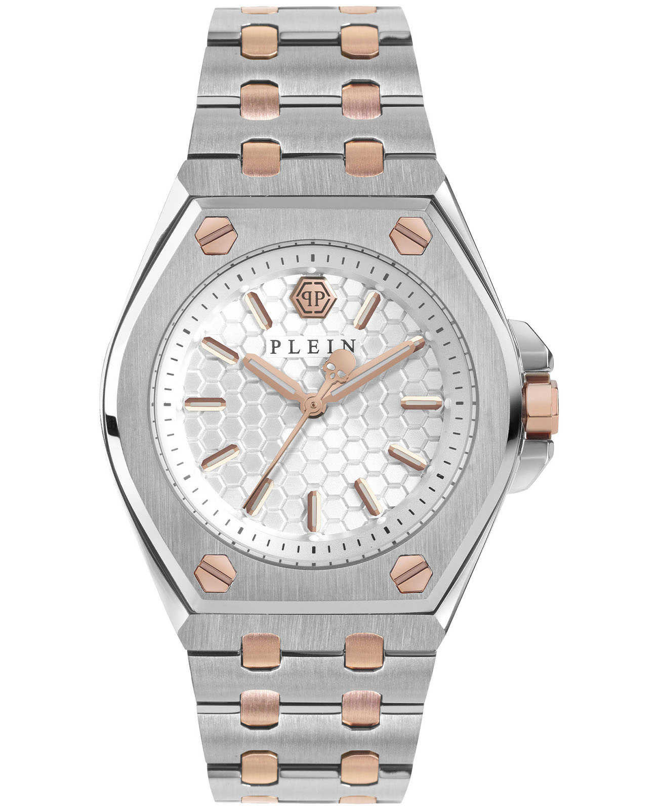 Своим оригинальным внешним видом и завораживающим блеском кристаллов эти часы, безусловно, привлекут внимание окружающих. Женские наручные часы Plein Extreme Lady. Круглый стальной корпус украшенный знаковыми винтами. Циферблат с шестиугольной текстурой с метками в виде точек украшенными коричневыми кристаллам и Swarovski и логотипом PP в положении 12 часов. Заводная головка с защитой. Стальной браслет с раскладывающейся застежкой. Фирменная дизайнерская упаковка.