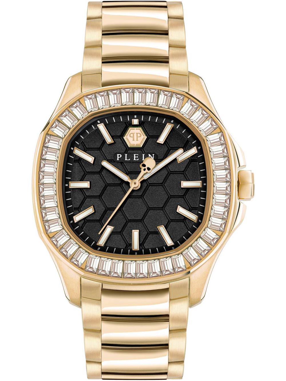 Яркие часы с вызывающим дизайном идеальный вариант для современного ритма жизни. Plein Philipp. Женские часы. Стальной корпус с геометричным безелем, инкрустированным кристаллами. Циферблат с крупной шестиугольной текстурой с метками в виде штрихов. Шестигранная заводная головка с защитой. Стальной браслет с раскладывающейся застежкой.