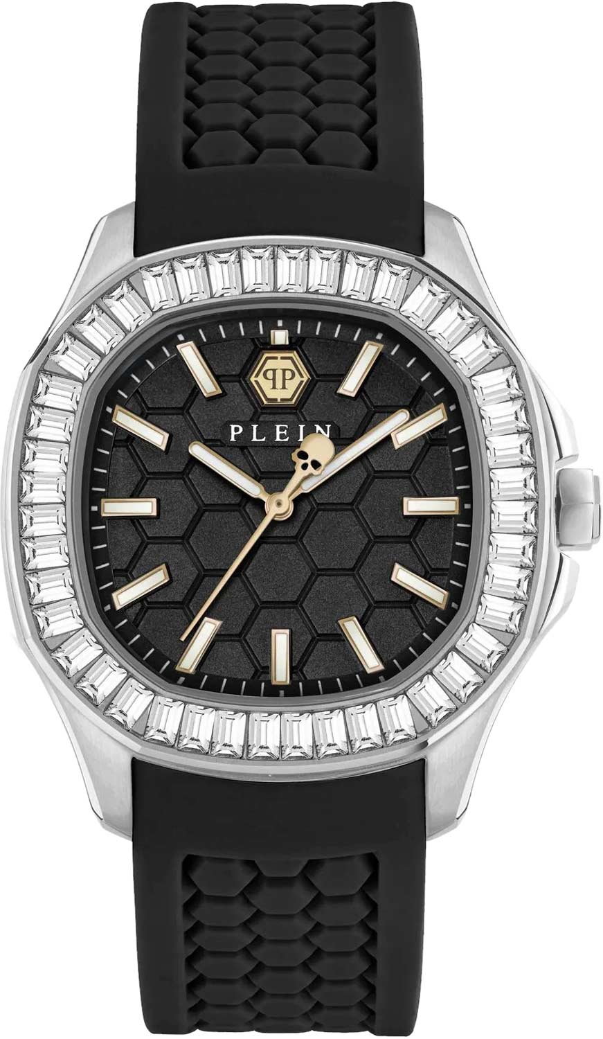 Яркие часы с вызывающим дизайном идеальный вариант для современного ритма жизни. Plein Philipp. Женские часы. Стальной корпус с геометричным безелем, инкрустированным кристаллами. Циферблат с крупной шестиугольной текстурой с метками в виде штрихов. Шестигранная заводная головка с защитой. Стальной браслет с раскладывающейся застежкой.