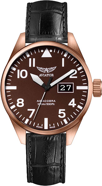 Аэрокобра П42 демонстрирует неразрывную связь между авиацией и часами. Циферблат сохраняет простой классический дизайн и стиль кабины с высокой контрастностью цифр и стрелок, обеспечивая выдающуюся четкость и читаемость. Кроме того, время хорошо видно в любых условиях освещения и при ярком солнечном свете дня и в полной темноте ночи, что достигается за счет нецарапающегося сапфирового стекла с антибликовым покрытием, и люминесцентными материалами на цифрах и стрелках. Другой отличительной особенностью является большое окно календаря в положении 3 часа, которое обеспечивает инструментальный внешний вид и идеальную четкость при считывании даты. С диаметром 42 мм и толщиной 13,3 мм корпус придаёт часам ощущение прочности и надежности.