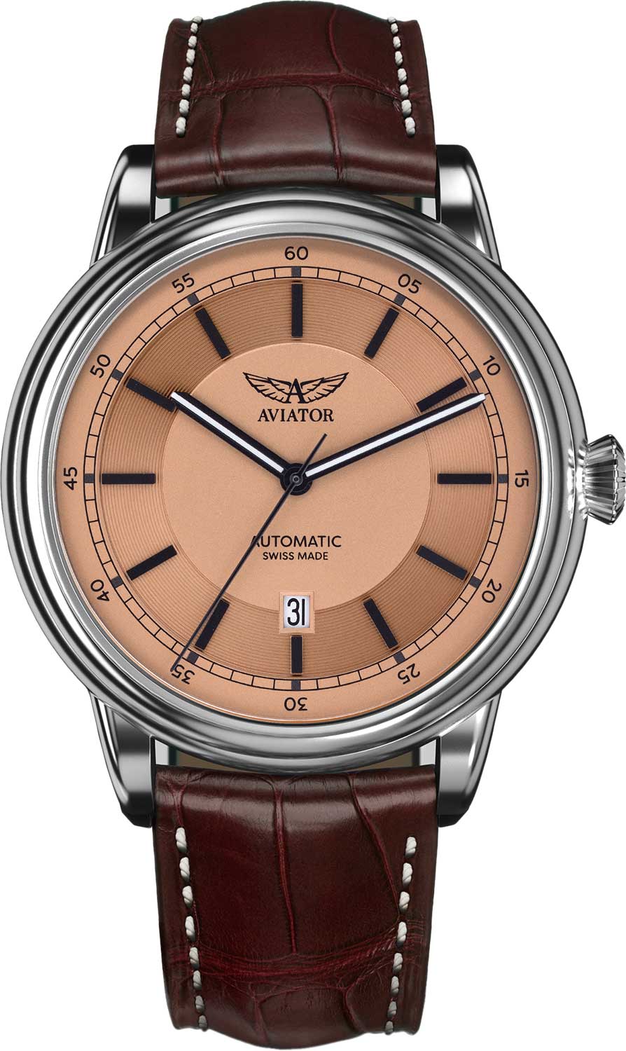 Douglas DC-3. Лимитированная серия. Коллекция Douglas была разработана в честь известного американского пассажирского самолета Douglas DC-3. В механизме 26 камней, частота 28800 полуколебаний в час. Калибр управляется регулятором Etachron , который обеспечивает высокую точность хода как на земле, так и над землей. Запас хода 38 часов. Противоударное устройство оси баланса Incabloc. Циферблат выполнен по технологии sun-ray (солнечные лучи). Часовые метки выполнены в виде штрихов. Полированный стальной корпус. Кожаный ремешок с тиснением под крокодила, с раскладывающейся застежкой. Прозрачная задняя крышка украшена имитацией функции контроля управления хвоста самолета. Ротор механизма указывает на градусы, как в авиационном приборе триммер. Калибр SELLITA SW200.