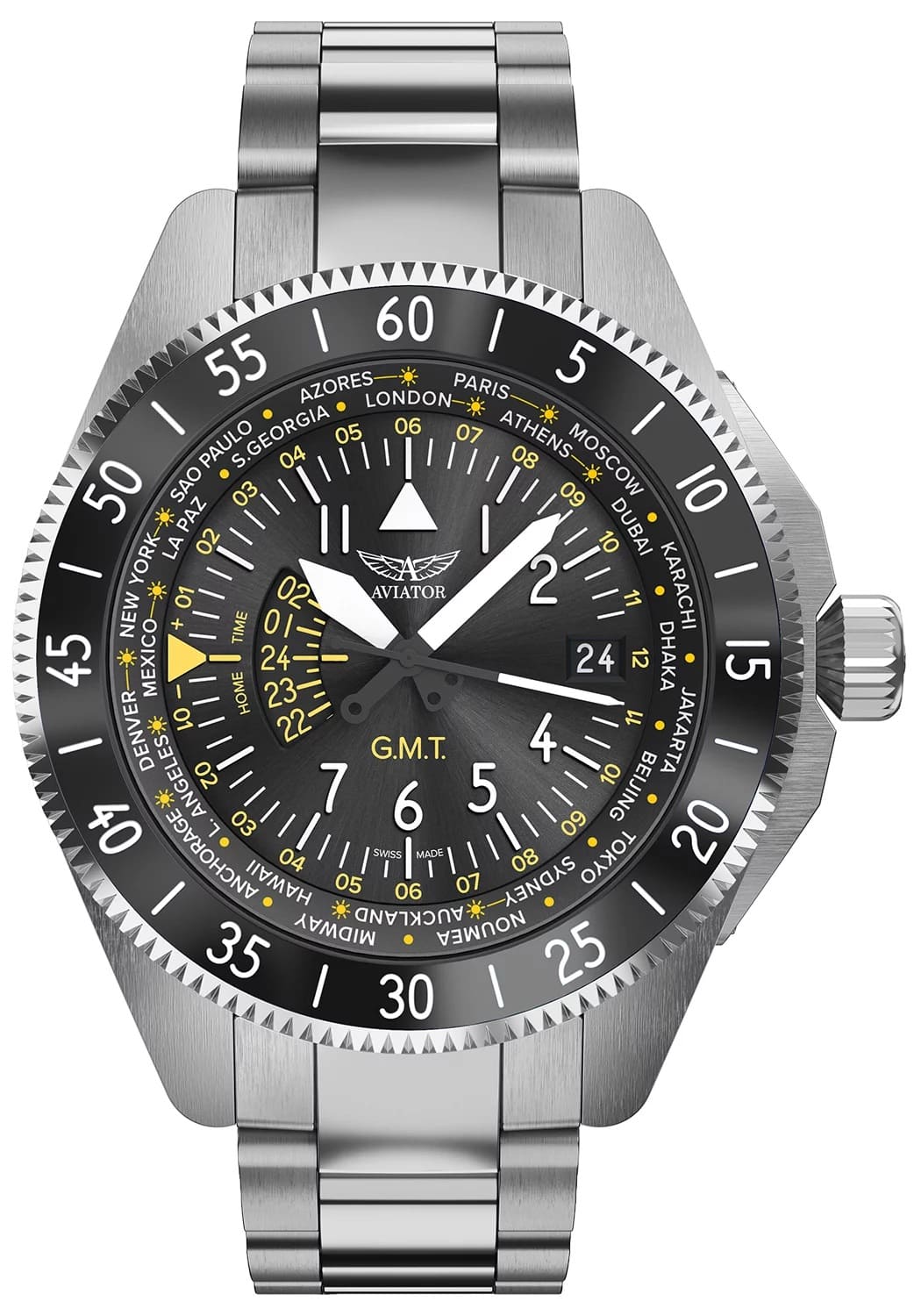 Часы продуманы и разработаны так, что каждая деталь дизайна будет напоминать вам о том времени, когда мужественные пилоты истребителя Airacobra взмывали в синюю высь. Мужские авиаторские часы. Функции даты, отображения времени по Гринвичу и мирового времени GMT. Вращающейся безель. Метки в виде арабских цифр. Стальной браслет.