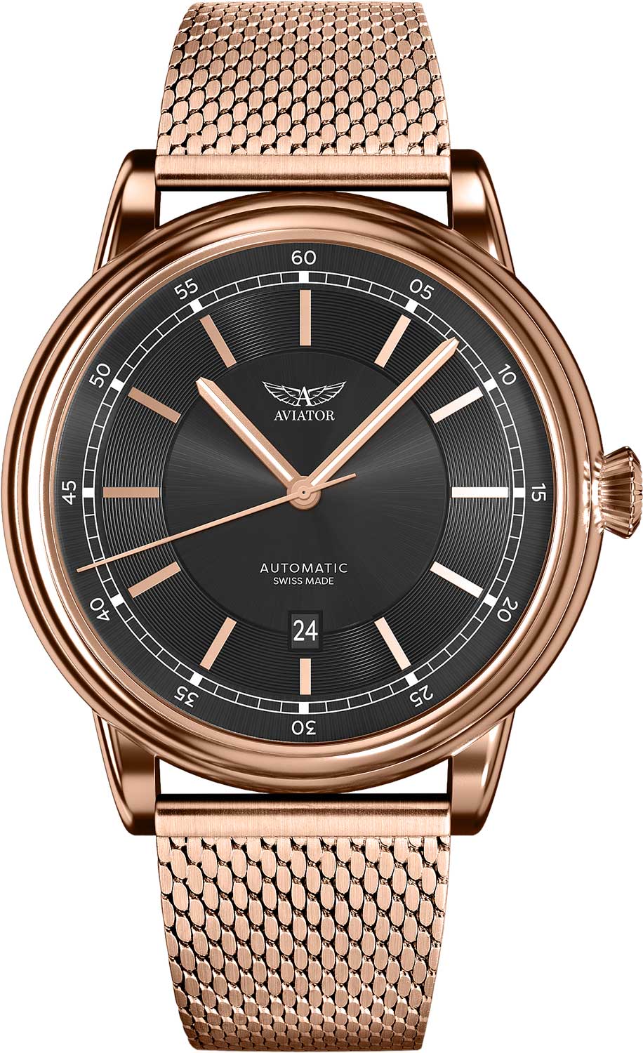 Тип Наручные часы Пол Мужские Страна Швейцария Механизм Механика, Автоподзавод Крепление Браслет Стекло Минеральное Форма корпуса Круг Размер корпуса, мм 45 Материал корпуса Сталь Цвет корпуса Розовое золото Водозащита, м 100 Циферблат Стрелки Цифры Метки Цвет циферблата Черный -