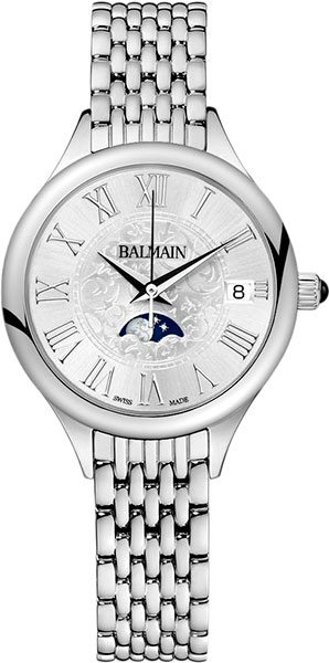 Стильный дизайн этого аксессуара смотрится особенно элегантно, благодаря шикарному циферблату. Balmain de Balmain Moon Phase. Циферблат часов украшен фирменным узором Арабески. Заводная головка украшена камнем в форме кабошона.Ультратонкие. Браслет стальной.Застежка клипса.