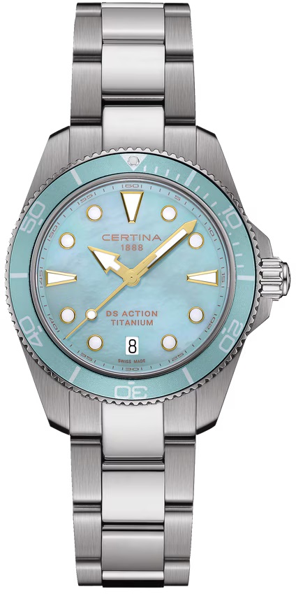 Тип Наручные часы Пол Женские Страна Швейцария Механизм Кварцевый Крепление Браслет Стекло Сапфировое Форма корпуса Круг Размер корпуса, мм 34 Материал корпуса Титан Цвет корпуса Серый Водозащита, м 300 Циферблат Стрелки Цифры Метки Цвет циферблата Голубой Дополнительные функции Дата -