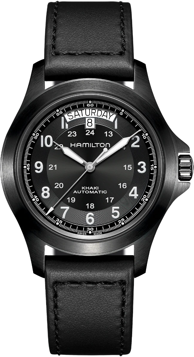 Армейские часы, навеянные военным наследием Hamilton, устойчивы к воздействию внешних факторов. Идеальная модель для любителей темноты Khaki Field King Auto в корпусе с PVD-покрытием имеет черный циферблат и черный кожаный ремешок, обеспечивающие максимально сдержанный дизайн.