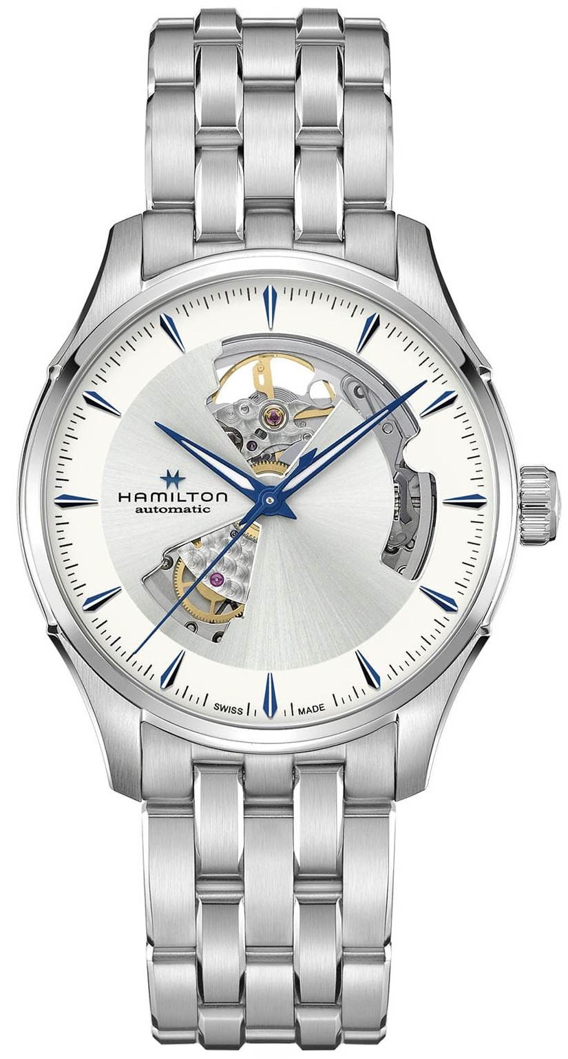 Классические часы сочетаются с современным дизайном в сине-серебристом цвете Jazzmaster Open Heart Automatic. Точные вырезы на циферблате 40 мм позволяют заглянуть внутрь швейцарского механизма и придают изысканным часам неповторимую индивидуальность.