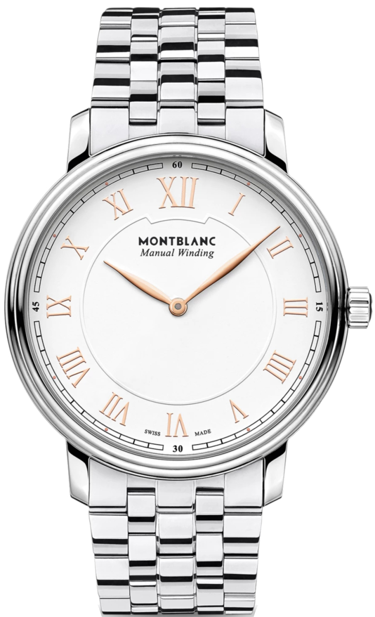 Новая модель Montblanc Tradition Manual Winding является воплощением неповторимого стиля Montblanc и классических канонов часового мастерства. Часы оснащены калибром MB 23.01 с ручным подзаводом. Дизайн корпуса из нержавеющей стали диаметром 40 мм сочетает характерные прямые ушки Montblanc с выразительным комбинированным безелем и выпуклым сапфировым стеклом. Классические каноны часового мастерства представлены в часах такими элементами дизайна, как серебристо белый циферблат, римские цифры и римская цифра XII большого размера. Традиционная минутная шкала в стиле железная дорога, а также стрелки классической формы Leaf и Baton завершают облик этой элегантной модели.