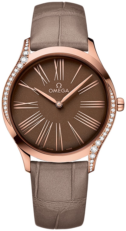 Тонкий корпус диаметром 36 мм изготовлен из золота и обрамлен с каждой стороны бриллиантовым паве, подчеркивающим плавные линии. Заводная головка с полированным красным покрытием HyCeram также украшена бриллиантом. На серо коричневом лакированном циферблате выделяются тисненые римские цифры из 18 каратного золота Sedna. Из этого же золота изготовлены стрелки часов.