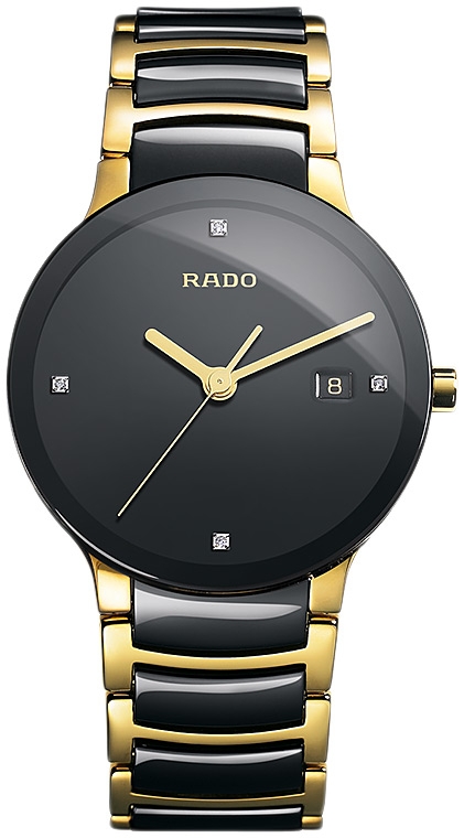 Корпус размера L, циферблат декорирован 4 бриллиантами, браслет со вставками из высокотехнологичной керамики и обрамляющими звеньями с PVD покрытием цвета желтого золота