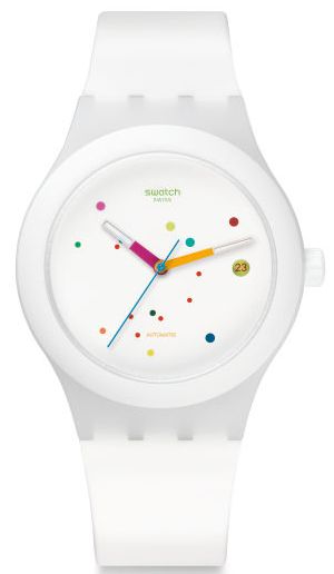 Тип Наручные часы Пол Унисекс Страна Швейцария Механизм Механика, Автоподзавод Крепление Каучук Стекло Пластиковое Форма корпуса Круг Размер корпуса, мм 42 Материал корпуса Пластик Цвет корпуса Белый Водозащита, м 30 Циферблат Стрелки Цифры Метки Цвет циферблата Белый -