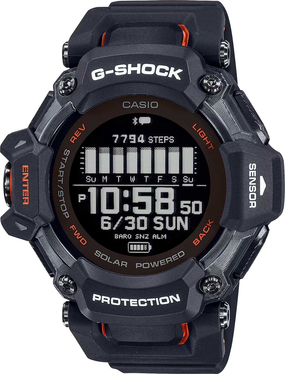 Перед вами первые часы Casio G-Shock с шестью датчиками. Помимо стильного внешнего вида, на борту модели в черном корпусе на полимерном ремешке присутствует, термометр, барометр, высотомер, компас, пульсометр, шагомер и гироскоп. Добавление в часы гироскопа позволило на порядок улучшить точность спортивных метрик, а также добавить новые режимы активности. Теперь в любом режиме от бега до плавания вы получите максимально точные показатели вашей активности, что позволит вам успешнее прогрессировать и добиваться поставленных целей. Отдельно отметим наличие технологий GPS и Bluetooth. Связь со спутниками позволяет строить маршрут в приложении, получать информацию о пройденном расстоянии, скорости, точном времени в данной локации. Блютус позволяет удобно отображать все метрики с часов на экране смартфона, а также выводить на часы уведомления о входящих звонках, сообщениях и имейлах. Из полезных особенностей GBD H2000 обладают вибро уведомлениями, а значит вы не пропустите важную встречу, сообщение или приближение к критической зоне пульса. Не забываем про стандартную для джишоков неубиваемость и водозащиту до 200 метров. Базовый часовой набор функций способен работать от зарядки с помощью солнечной батареи, если вы будете пользоваться полным функционалом с GPS и пульсометром, вам потребуется USB зарядка, которая обеспечит работу часов до 14 часов.