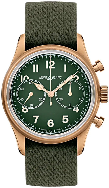 Коллекция Montblanc 1858 черпает вдохновение в наследии легендарных профессиональных часов Minerva 1920-1930-х годов, предназначавшихся для военных и исследователей. Переосмысливая облик легендарных предшественников, модели из коллекции Montblanc 1858, посвященные альпинизму, воссоздают актуальный сегодня дух единения с природой. Модель 1858 Chronograph, выпущенная лимитированной серией из 1858 экземпляров, помещена в корпус диаметром 42 мм из бронзы, а ее циферблат цвета хаки служит идеальным фоном для двух счетчиков. На задней крышке выгравированы изображения легендарной вершины Монблан, компаса и двух скрещенных ледорубов, напоминающие о духе высокогорных восхождений. Современный акцент модели придает высококачественный текстильный ремешок, сочетающийся по цвету с циферблатом.